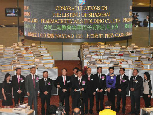 2011年5月20日,上海医药集团股份有限公司董事长兼执行董事吕明方(前中)在上市仪式上致辞。当日,上海医药集团股份有限公司在香港交易所主板成功挂牌上市。(新华社)