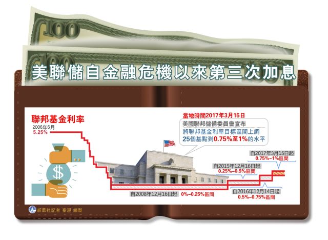 新华网北京3月16日电(记者江宇娟 高攀)美国联邦储备委员会15日宣布将联邦基金利率目标区间上调25个基点到0.75%至1%的水平。这是美联储自金融危机以来第三次加息,符合市场普遍预期。