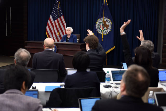 新华社照片,华盛顿,2017年3月15日,在美国华盛顿,美国联邦储备委员会主席耶伦(后)出席新闻发布会。美国联邦储备委员会15日宣布上调联邦基金利率,这是美联储自金融危机以来的第三次加息。(新华社记者 殷博古摄)