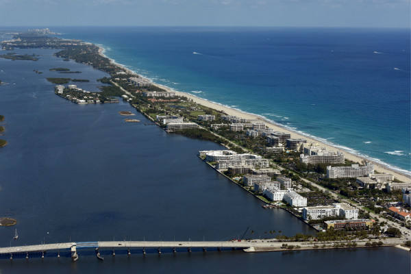 这是2017年3月20日航拍的美国佛罗里达州棕榈滩的海岸线,海湖庄园就在这个狭长的小岛上。(新华社记者殷博古摄)