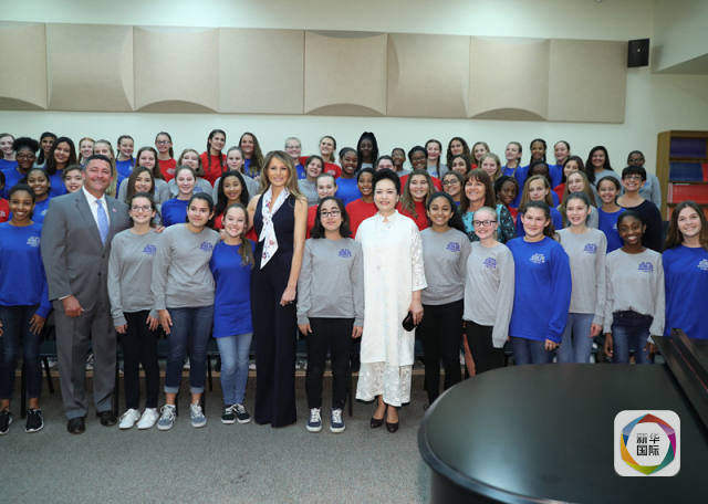 当地时间4月7日上午,应美国总统夫人梅拉尼娅邀请,国家主席习近平夫人彭丽媛参观位于佛罗里达州西棕榈滩市的巴克艺术中学。这是彭丽媛同梅拉尼娅在参观声乐教室后与学生们合影。(新华社记者丁林摄)