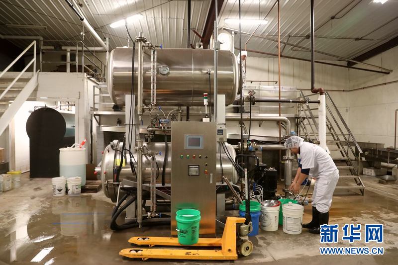4月9日,在美国艾奥瓦州首府得梅因郊区的艾奥瓦食品制造公司(Iowa Food Manufacture Inc.)的豆腐厂内,工人在生产前调试设备。新华网记者 汪平 摄