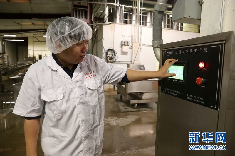 4月9日,在美国艾奥瓦州首府得梅因郊区的艾奥瓦食品制造公司的豆腐厂内,中方人员在操作豆腐制品生产设备。 新华网记者 汪平 摄