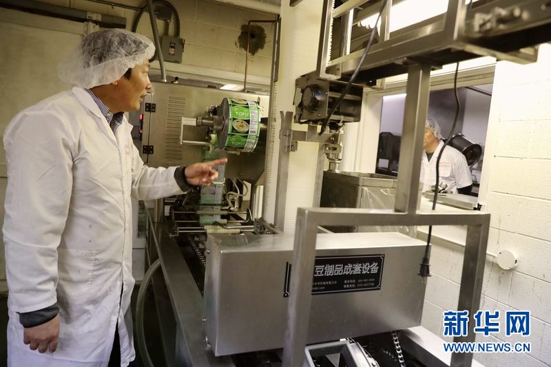 4月9日,在美国艾奥瓦州首府得梅因郊区的艾奥瓦食品制造公司的豆腐厂内,中方员工交流豆腐生产流程。 新华网记者 汪平 摄