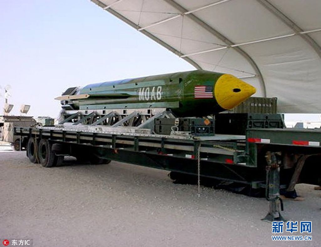 资料图:被称为“炸弹之母”的大型空爆炸弹。当地时间2017年4月13日报道,据美国五角大楼证实,美军向阿富汗投放了被称为“炸弹之母”的大型空爆炸弹。此次袭击发生在阿富汗东部楠格哈尔省亚钦地区,美国空军特种作战部队一架MC-130战斗机掷下了一枚超过2万磅,相当于10吨的精确制导“大型空爆”炸弹。美军称他们的袭击目标是极端组织藏匿的隧道和基地。目前驻阿美军正在估测此次袭击造成的伤亡情况。(图片来源: 东方IC)