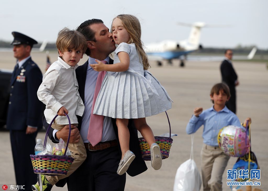 当地时间2017年4月16日,美国马里兰州安德鲁空军基地,总统特朗普与家人欢度复活节周末后乘专机返回。图为小唐纳德-特朗普亲吻自己的女儿。(图片来源: 东方IC)