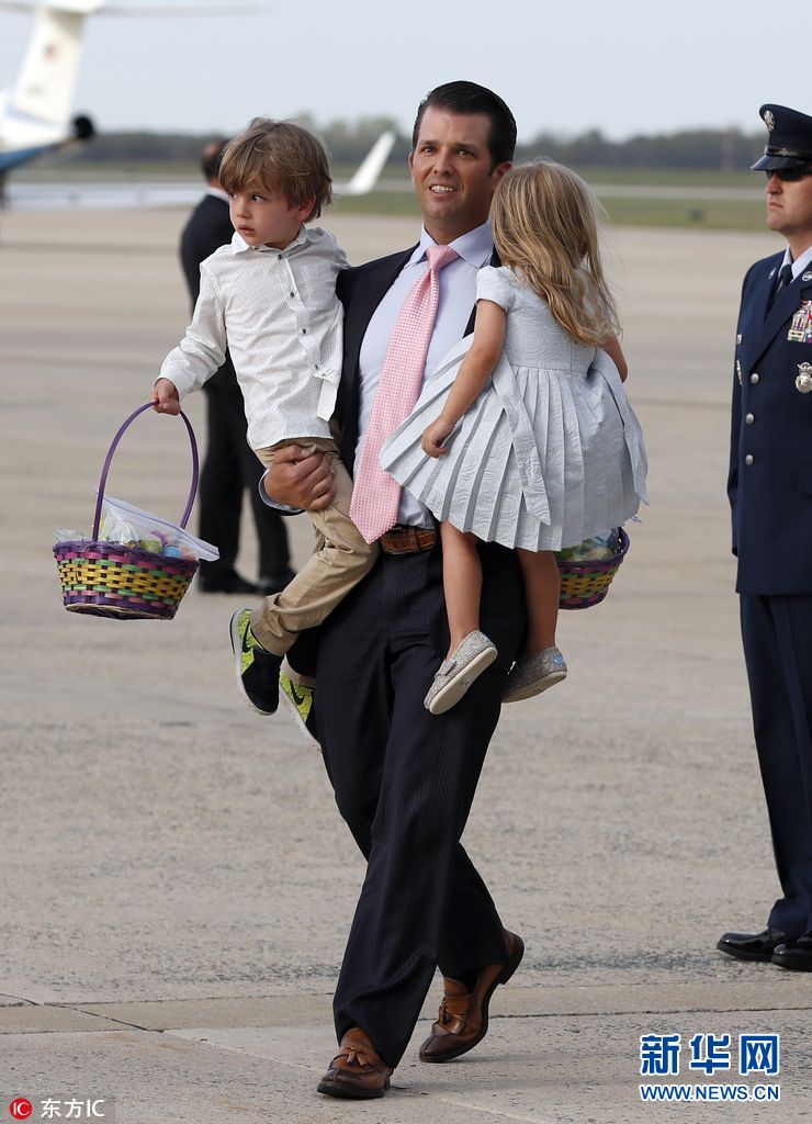 当地时间2017年4月16日,美国马里兰州安德鲁空军基地,总统特朗普与家人欢度复活节周末后乘专机返回。图为小唐纳德-特朗普抱着自己的儿女。(图片来源: 东方IC)