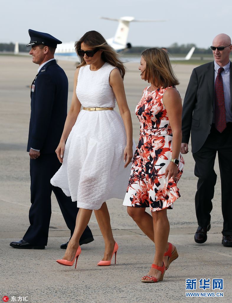 当地时间2017年4月16日,美国马里兰州安德鲁空军基地,总统特朗普与家人欢度复活节周末后乘专机返回,美国第一夫人梅拉尼娅身穿白色长裙现身,美艳动人。(图片来源: 东方IC)