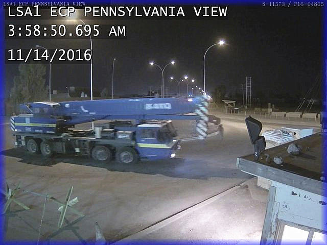 2016年11月14日监控视频截图显示一辆吊车驶离拜莱德基地,未有安保人员查问。(新华/美联)