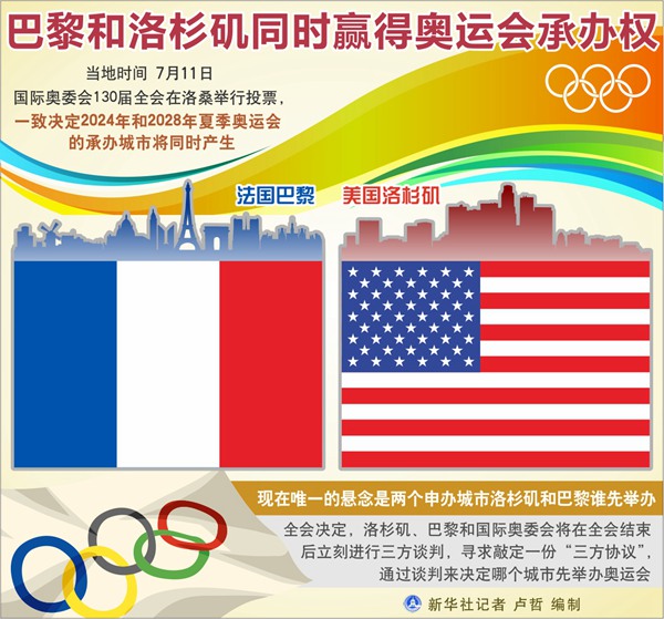 图表:巴黎和洛杉矶同时赢得奥运会承办权 新华社记者 卢哲 编制