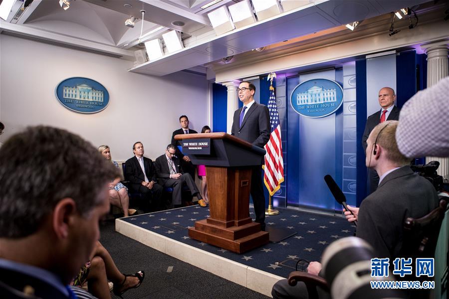 7月31日,在美国首都华盛顿,美国财政部长姆努钦(中)出席新闻发布会。