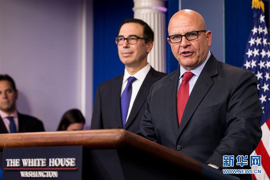 7月31日,在美国首都华盛顿,美国总统国家安全事务助理麦克马斯特(右)和美国财政部长姆努钦出席新闻发布会。