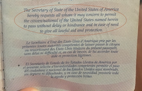 直译过来,意为:“美利坚合众国国务院特此请求允许持证美国公民/国民过境,不要延误办理或设置阻碍,并在需要时给予法律援助和保护。”以下两段为其发文和西班牙文的同义表述。