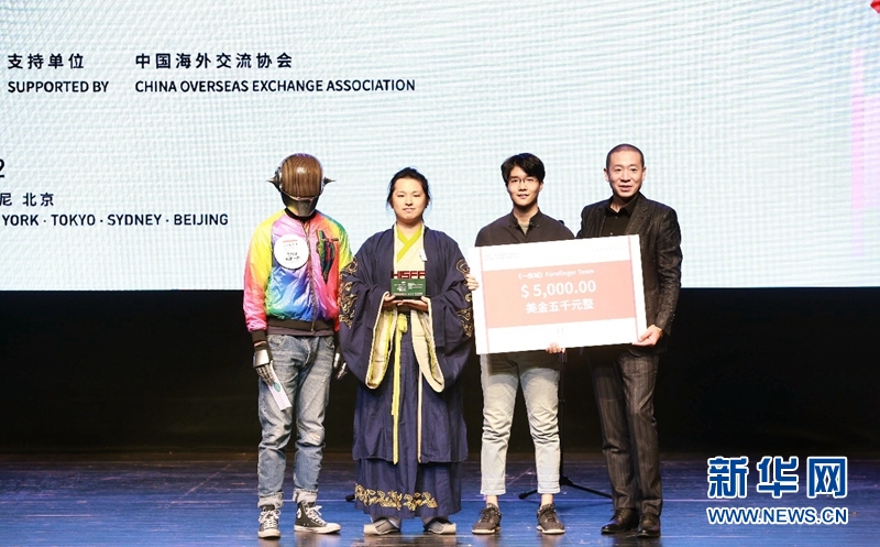 12月3日,颁奖嘉宾梁龙、机器人“两室一厅”为“青铜时代”单元最佳短片《一指城》颁奖。当日,2017华时代全球短片节闭幕式暨颁奖典礼在北京天桥艺术中心举行。新华网发