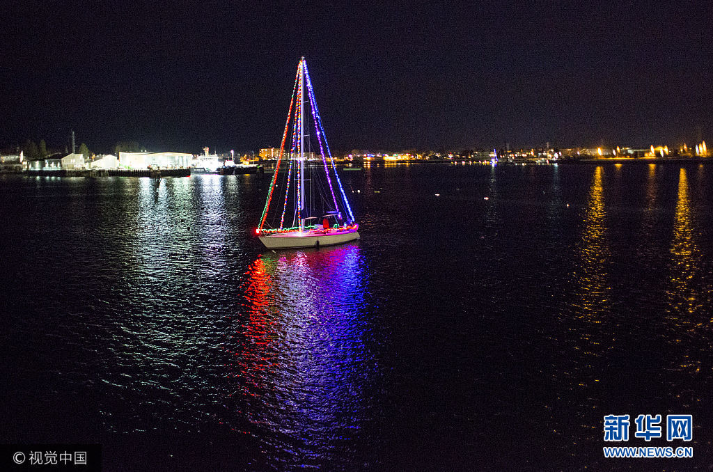 当地时间2017年12月16日,美国波特兰港,被灯光照亮的帆船在波特兰港参加一年一度的游行。(图片来源:视觉中国)