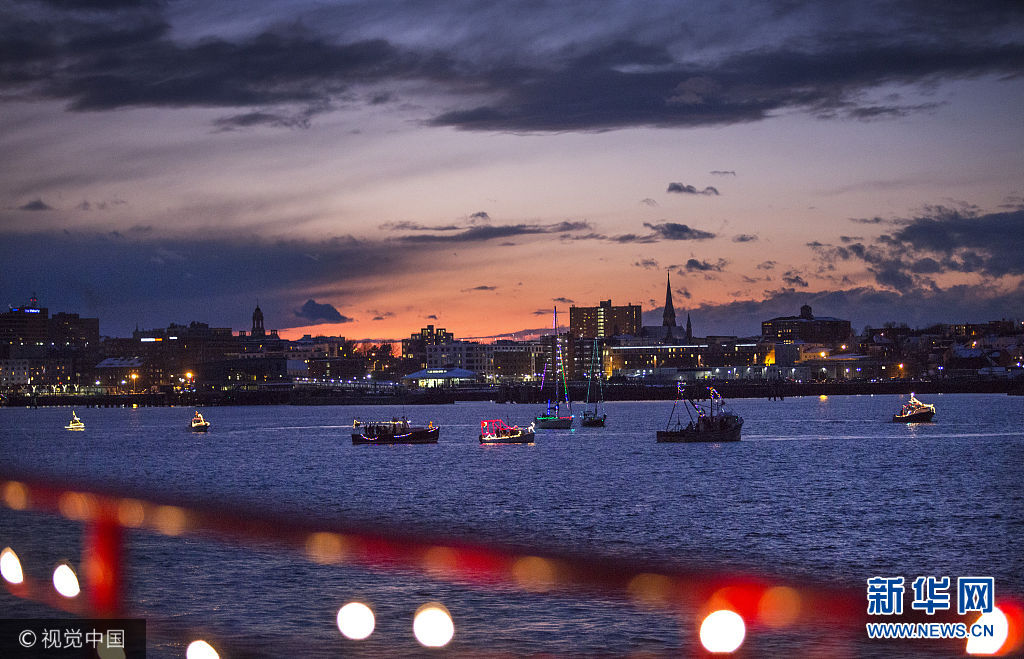 当地时间2017年12月16日,美国波特兰港,被灯光照亮的帆船在波特兰港参加一年一度的游行。(图片来源:视觉中国)